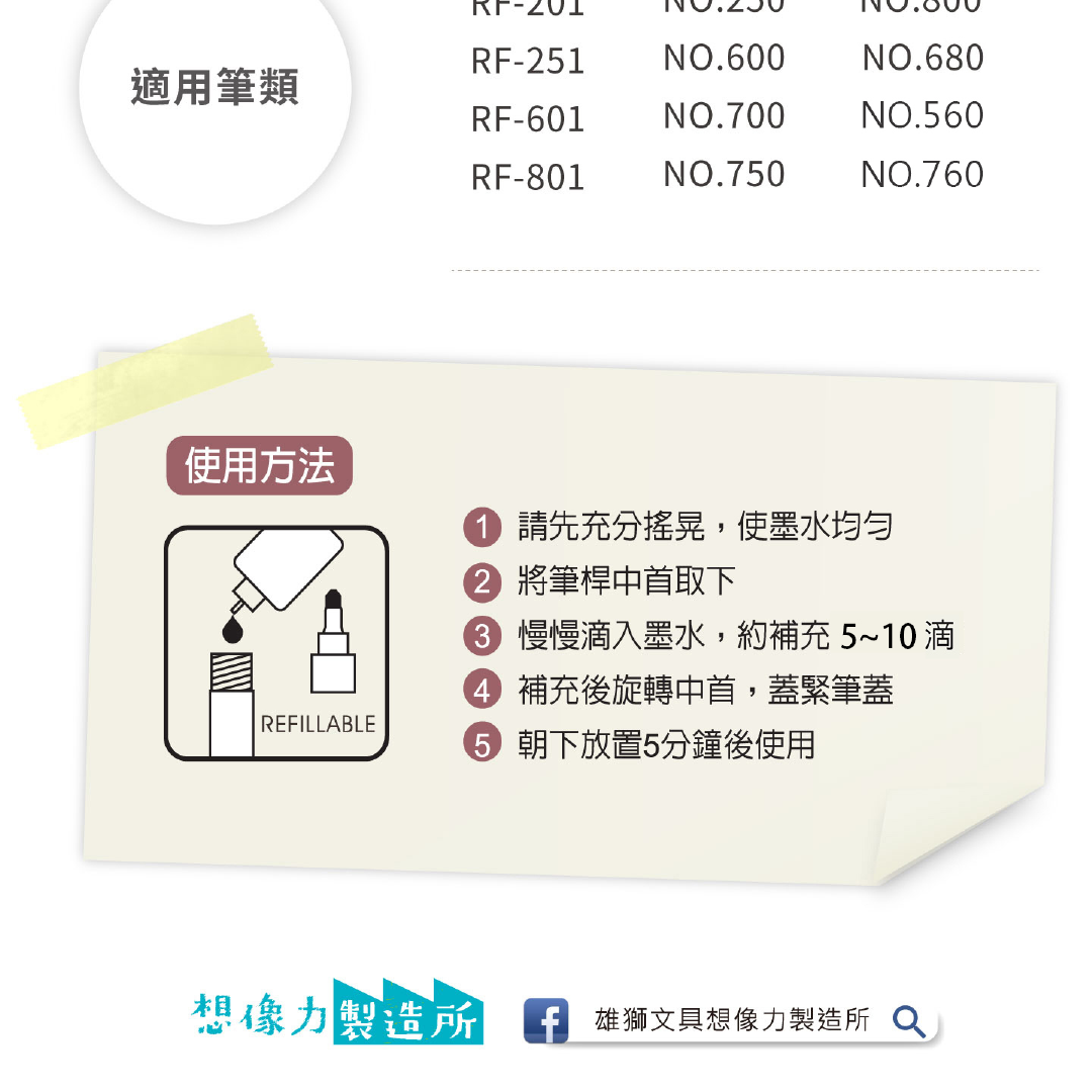 適用筆類:RF201、RF251、NO.560、NO.601、NO.801、NO.250、NO.600、NO.680、NO.700、NO.750、NO.760、NO.800奇異筆補充專用