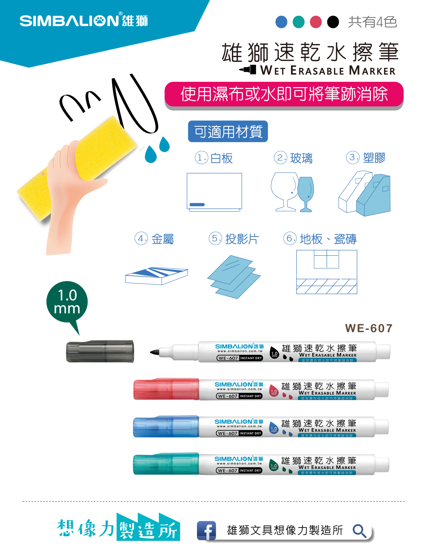 速乾水擦筆採用獨家研發配方書寫筆跡速乾,顏色鮮明清楚,平面光滑的材質表面上作記號標示、書寫及彩繪,想去除筆跡時,只要使用濕布或清水就能完全清除筆跡